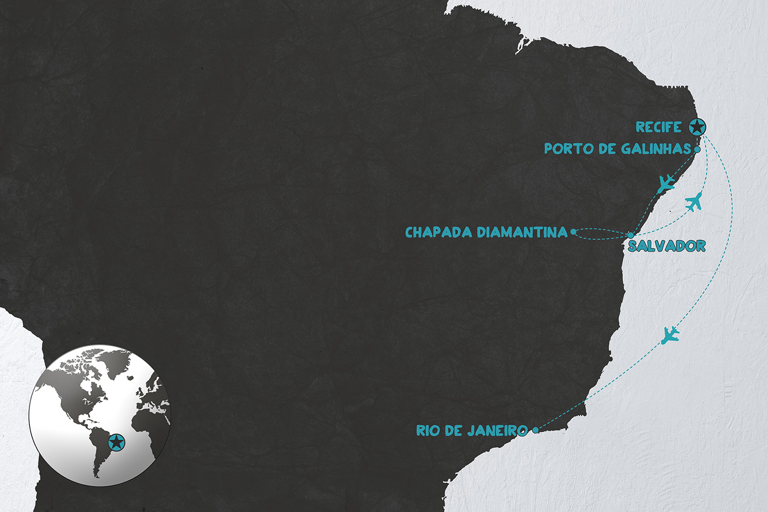 Du ankommer Brasil og blir ønsket velkommen av guidene dine. Herberget ligger i nærheten av den sjarmerende lille fiskerlandsbyen Porto de Galinhas, sør for Recife. Her serverer guidene en velkomstmiddag, og du får ditt første møte med brasilianske rytmer og mat. Den neste uken skal dere bade i naturlige bassenger og kjøre beach buggy på stranden.